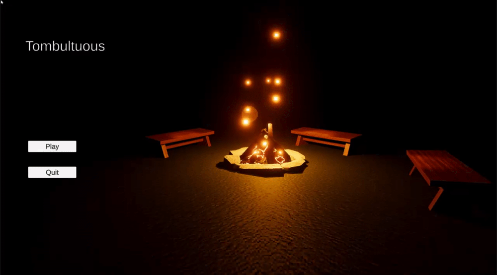 I’ve added the most barebones main menu. It contains a simple 3d scene featuring a campfire with some benches around and a play and quit button. The play button transitions the player to the hub and the quit button closes the application.