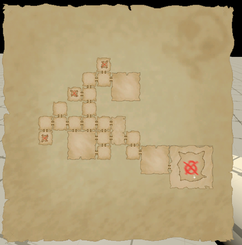 The aesthetic I’m going for is someone sticking old pieces of paper to an older piece of paper/hide as they chart their path. Special rooms such as the boss room and the treasure room have an additional patch attached onto the paper. This is reminiscent of old sailor maps which often had corrections applied by gluing pieces of parchment overtop the already existing map. Below is a fully charted map.