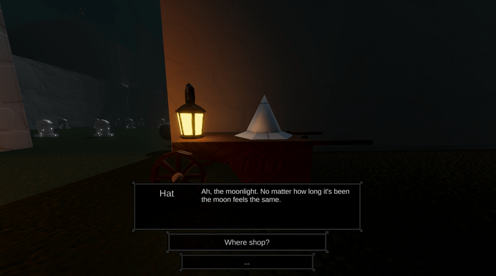 Ending the run will flip a saved value which will cause Hat to spawn at the Hub. He will be positioned on top of a cart with a lantern. If spoken to, he talks about vague lore stuff and says he’s still setting up his shop. This is because I haven’t implemented the shop. I do like the dialogue so I may add a second condition to opening the shop.