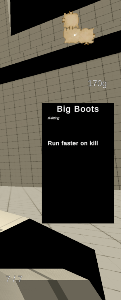 Due to people not reading items I have added a UI element that appears on screen when the player picks up an item. This element displays the name and effects of the item much like the floating in world UI. This is to help people have a double take of what they’ve just picked up in a fixed location.