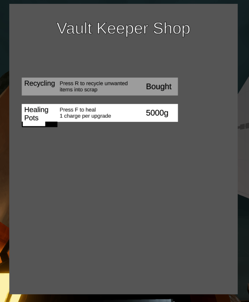 Both these items are critical to the overall gameplay loop and are fairly self-explanatory. Previously I planned on having recycling convert unwanted items to gold but I received the feedback that requiring the player to scrap items as part of the progression loop would be more interesting. I agree so I’m pivoting my design toward that path. Hat’s shop (WIP) will take both scrap and money to unlock new items as opposed to just gold.