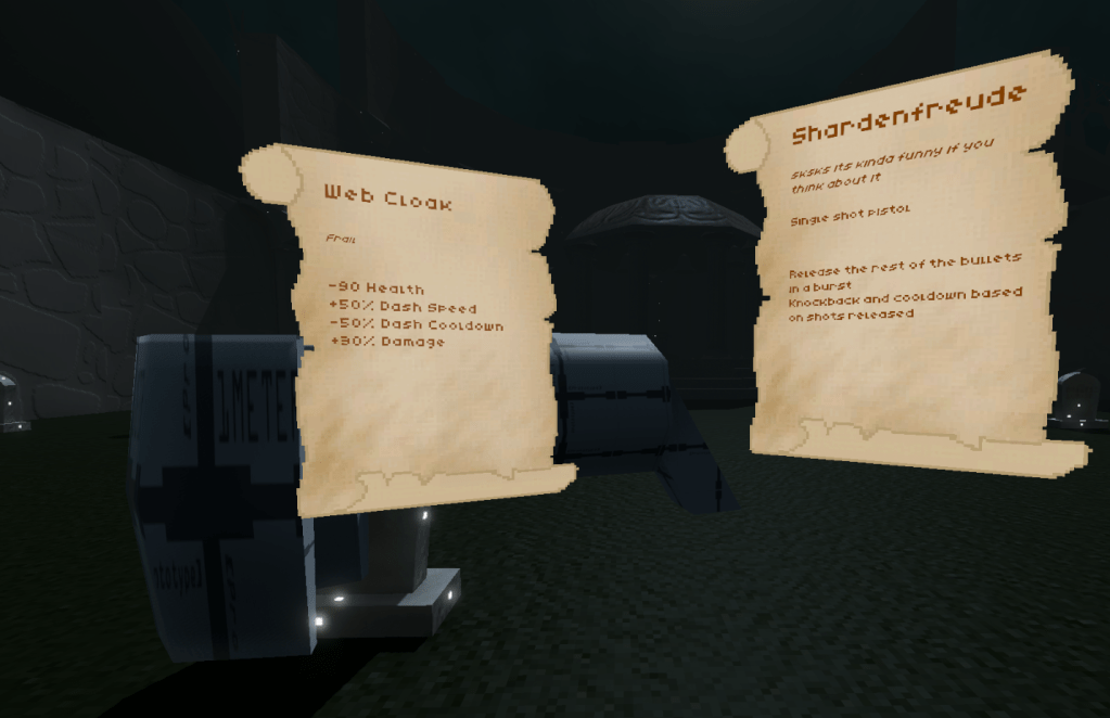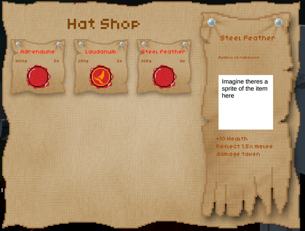 The Vault Shop and Item Descriptions are essentially identical to the prototype as sprites simply replaced. However, the item shop is a completely different beast. Clicking on an item brings up the side panel displaying its stats. To purchase an item the player must click on the wax seal. It’s not exactly how wax seals work but it feels so intuitive that I doubt people will get confused. I’m actually so happy with how the item shop UI turned out. I will need to tinker with the position of the pricing and incorporate the player’s current currency in the UI. With some testing I may change the colour of the text. The text is designed to look like old, faded ink, which it does, but it may be too hard to read for some players. But that remains to be seen.