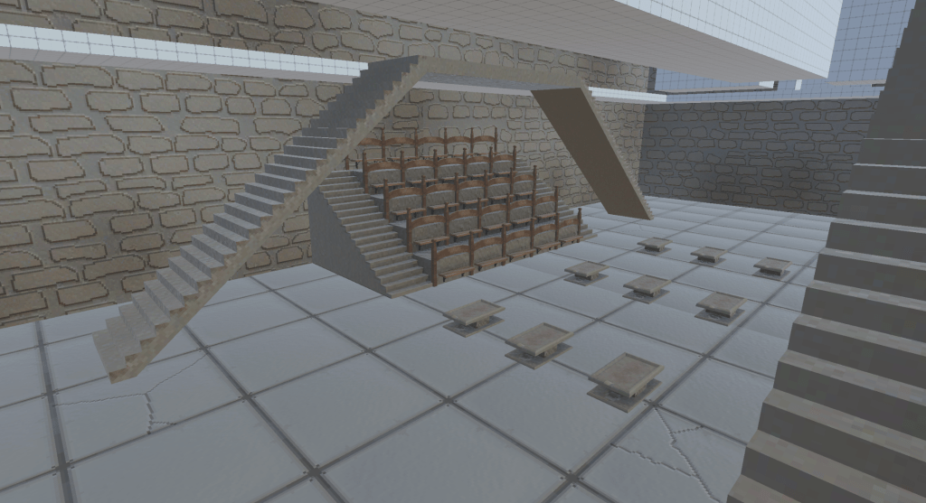 I made the staircase and stands for tile TS1_1x2_1. The stands involve lots of duplicated meshes with the same material applied to all of them. I worry about the optimisation of having it be many props in one. Somewhere online I heard that static props will functionally merge into 1 so hopefully that’s real. But if I run into performance problems the first thing I’ll do is combine that mesh and materials into 1.