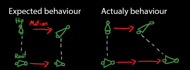 Before my root motion system allowed animations under the control of root motion to phase through walls. I have changed it, so this doesn’t happen. I don’t know the way to explain it, but it works exactly how you would intuitively expect it to now. Alongside this I fixed the root bone of the boss enemy. It seems blender’s copy location constraint doesn’t really work properly when exported into unity. I’m not exactly sure if it’s a rotation thing or a position double dipping thing (Below is diagram of issue) but I kept those constraints and parented the root bone to the hip. This seems to solve the problem entirely, but I imagine there could be some unforeseen consequences of it.